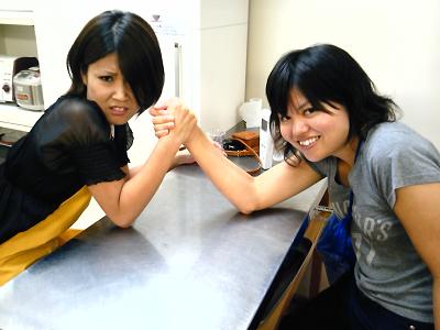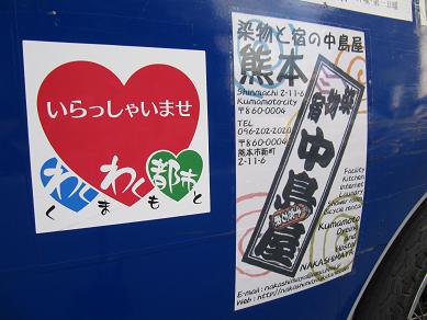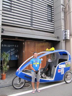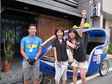 いきなり、変顔でお掃除スタッフのAyumiさんと腕相撲。 そして、染物体験ではかわいいTシャツが完成いたしました☆ それで、これまた先日のブログでも登場いたしました 熊本の中心地を走っているベロタクシー(自転車タクシー)が、 染物と宿の中島屋の前に横付け! そして、そして、 ベロタクシーのサイドを良く見てみると、ビックリ!!! 染物と宿の中島屋の広告が!!! いつのまに・・・。(本当に知りませんでした) そして、染物と宿の中島屋の広告つきのベロタクシーに乗って、 この元気な2人が城下町ガイドツアーに出発! 熊本を満喫しているこのお客様ですが、 実は、東京の大学の卒業論文の調査のために熊本に長期滞在なのでした。(勉強熱心な方です) ちなみに、翌日、このベロタクシーのドライバーさんが 染物と宿の中島屋にお泊りに来ていただきました☆ ありがとうございました! PR