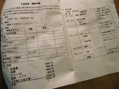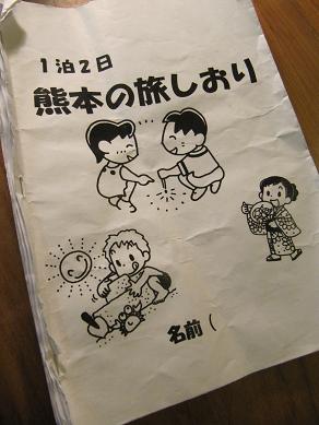 先日ご宿泊いただいたお客様は こんなにかわいらしい「1泊2日 熊本の旅しおり」を 製作して持参されてました☆ 中を開けてみると、 着替えやタオルの枚数や、お小遣い、 1日の活動内容や、熊本の食事、ショッピング、遊園地情報まで! 全8ページに及ぶ本格的なしおりです。(1泊2日なのに) そして、このしおりを持って熊本の観光をしているのは、 なんと! 腕相撲で白熱しているイカツイお兄さん達でした☆ とても、元気でさわやかな方々で、 実は、小中学校の先生のみなさんだそうです。 きっと、旅のしおりを作る事なんて朝めし前なんでしょうね! そして、朝から染物体験!ピンク率が高いですが(笑) この後は、みんなで、三井グリーンランドでプールだそうです! ずっと笑いの絶えない皆さんでした☆ またのお越しをお待ちいたしております。 PR