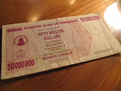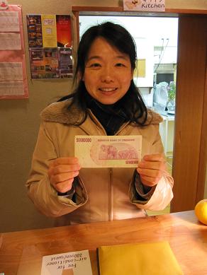 なかなか、ゆっくりパソコンの前に座ることが出来なくて・・・(言い訳) 先日ご宿泊いただいたお客様のお財布に 今まで見たこともない国のお札がチラリと見えてしまったので、 見せていただきました! ジンバブエに行かれた時の記念でお持ちだそうです。 おわかりいただけたでしょうか。。。 そうです! 50,000,000ドルです! 5千万ドルです! おもちゃのお金でもここまで高額な紙幣は見たことありません! 驚きなのはこれだけではありません。 紙幣中央にズームアップしてみると、 お金なのに使用有効期限付き! 期限内に使わないとただの紙切れになってしまうお金って、 景気が良くなるかもしれませんね☆ ちなみに、この5千万ドル紙幣はインフレ対策で発行されたとの事で、 価値としてはパンが1つ買えるくらいだそうです。 更に調べて見ると、 ジンバブエの最高額面紙幣は1000億ドルだそうです!(世界最高額面) ジンバブエの250億ドルがアメリカの1ドルと同じだそうです。 世界では色々なことが起こっているんですね! おもしろい! 熊本城の見える安いゲストハウス「染物と宿の中島屋」 PR