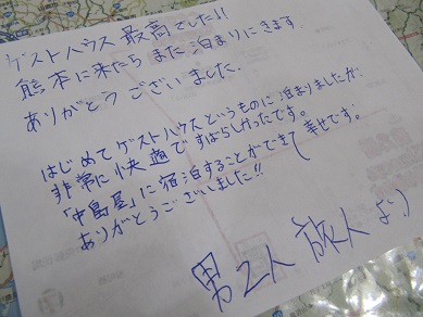もう3月? 毎年、全国で同じような話を耳にしますが、 海外でも1月~3月は月日が経つのが早く感じるのでしょうか? そんな機会があったらゲストさんに聞いて見ます☆ さて、 3月1日は嬉しい朝でした♪ こんな置手紙を頂きました☆ 「男2人 旅人 より」 爽やかなお2人でした! また、熊本にお越しの際はお待ちいたしております! この嬉しさで3月も頑張ります!!! 熊本城の見える安いゲストハウス「染物と宿の中島屋」 |