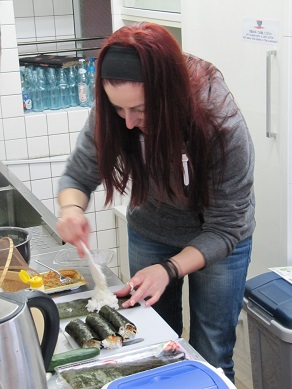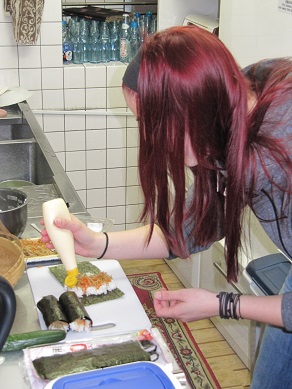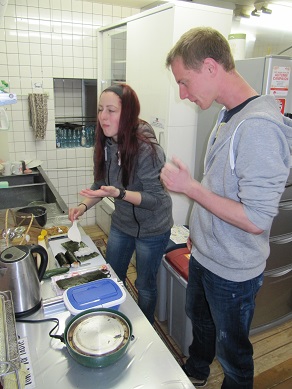 キッチンで朝からお客様がピクニックの準備中☆ きんぴらにマヨネーズの特製手巻き寿司! お二人でつまみ食いをしながら 味も上々のようです! 中島屋のキッチンで お弁当を作ってピクニックに行ってみませんか? 熊本城の見える安いゲストハウス「染物と宿の中島屋」 |
