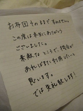 毎朝、 チェックアウトされたお客様のお部屋をお掃除します! 先日、 そんなチェックアウトされたお部屋の掃除に入ると、 これから寝るのかと思うほど 綺麗に整えられたお布団。 んんん? 布団の上にお手紙が添えられております! なんとも嬉しいお手紙♪ もちろん、 お布団もそのままで大丈夫です! 本当に、ご丁寧にありがとうございました! またのお越しをお待ちいたしております☆ 熊本城の見える安いゲストハウス「染物と宿の中島屋」 |