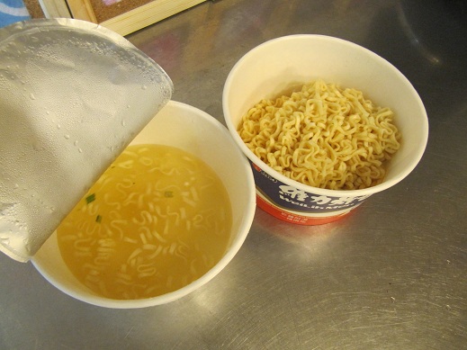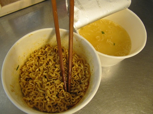 カップメンの話になりました☆ 「日本ではカップが1つだけど、 台湾では2つカップがある。」とのこと。 いまいちカップが2つ必要な意味がわからないでいると、 「よし!作ってあげよう!」 と、言うことになり、 どこからともなく話題のカップメン登場(笑) 一見すると普通のカップメンだが、 開けてビックリ! 本当にカップが2つ! そして、 1つ目のカップには、 日本と同様に麺とスープの素を入れてお湯を注ぐ。 気になる2つ目のカップには、 何やら見慣れない特製味噌をスタンバイ! 3分経つと、 食べごろになった麺だけを特製味噌のカップへ移す。 後は、 日本のカップ焼きそばみたいに混ぜると完成☆ 麺が取り出されたカップはスープとなる優れもの! 味はちょっとピリ辛で美味い!!! そして驚くことに、 途中でスープを飲もうとすると怒られました。 どうも食べ方にルールがあるようで、 麺を全部食べてからでないとスープは飲んではいけないそうです(笑) 日本で言う蕎麦湯みたいなものでしょうかね? それにしても、 麺もスープもおいしかったです!!! 日本で買うことが出来るのであれば、 もう一度食べたいカップメンです☆ ごちそうさまでした♪ 熊本城の見える安いゲストハウス「染物と宿の中島屋」 |
