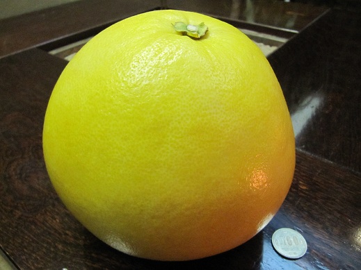 ギネスも認定した世界最大のものがあります! その名も「晩白柚(ばんぺいゆ)」 柑橘系では最大の大きさを誇り、 果肉もみずみずしく美味しいのです! 熊本ではこの時期の八百屋さんや、 果物売場では日常的に見かけます☆ そして、 熊本の人は購入してもすぐには食べません! メロンなどと同じく、 少し置いておくとより、 美味しくなるので、 熟成かねて、 玄関や床の間で観賞用として飾られるのです☆ なので、 染物と宿の中島屋の玄関にも 現在、熟成かねて飾ってあります♪ 画像は大きさの比較の為に、 500円玉を右下に置いております。 これでも小ぶりなもので、 大きいものになるとバスケットボール程になるそうです! 熊本のお土産におひとついかがですか? 熊本城の見える安いゲストハウス「染物と宿の中島屋」 |