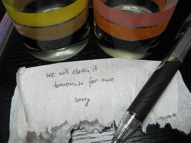寝静まった宿を深夜巡回していると、 談話室がこんな状況に。 空のオレンジジュースと2つのグラス。 その前には、 ちぎられたティッシュになにやらメッセージが。 「ごめんなさい。明日、洗います。」的な内容に笑ってしまいました☆ 中島屋では自分が使った食器は洗って元の場所へ、 と、言うルールなのですが、 きっと睡魔に負けてしまったのでしょう(笑) この日は、 寝ている間に「コビト」さんが洗ってくれたようなので大丈夫でしたよ☆ 熊本城の見える安いゲストハウス「染物と宿の中島屋」 |