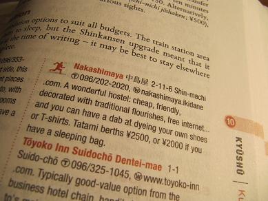 突然の飛び込みでオランダからのお客様がチェックインです! そして! 彼の手には「あの」ガイドブックです! 先月のブログで紹介させていただいておりましたが、 知らない間に染物と宿の中島屋が掲載されていた 世界的に有名なガイドブック「ラフガイド」です☆ その時のブログ⇒http://nakashimaya.blog.shinobi.jp/Entry/621/ 早速、中身を見せていただきました! もちろん載っています(喜) 少し追加したい内容もありましたが、 ラフガイドマーク(オススメマーク)付きで感謝です! 梅雨の中なのに晴れやかな気持ちにさせていただきました☆ 染物と宿の中島屋は旅人にとって私もオススメいたします(笑) それでは、 これからも皆さまのお越しを心よりお待ち申し上げております。 熊本城の見える安いゲストハウス「染物と宿の中島屋」 |