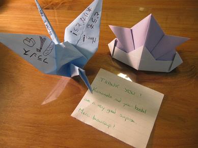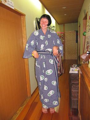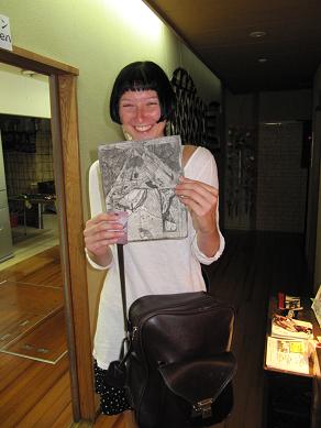 日本の温泉好きで、連日各地の温泉を巡っていらっしゃいました。 そして、夜になると、自前の浴衣でおやすみです! カメラを向けると、照れ笑いでハイポーズ☆ そして、最終日。 一日中部屋から出てこられずに引きこもり。 何をしていたのかと言うと、 とってもお世話になったから! と、染物と宿の中島屋の為に、 絵を描いていらっしゃったそうです(嬉) そして、カメラを向けると照れ笑い(笑) 実は、彼女はアーティストで、 色々な賞を受賞して、 今では、スコットランドの大学で芸術を教えている先生でもあり、 ギャラリーのオーナーでもあるそうです☆ そして、今回描いていただいた作品は、 特殊な技法で描かれており、紙の裏から、金属のペンで描いてあるそうで、 手で触ると、線が立体的に浮き出ています! 作品は染物と宿の中島屋の受付に飾らせていただきます☆ ちなみに、彼女の作品・経歴のホームページはこちら↓ ![]() 旅行中の貴重な時間を費やして描いていただき、 本当にありがとうございました☆ |