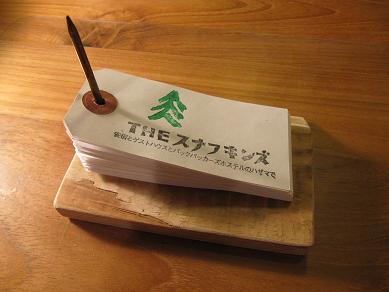 私の知っているだけでも12~13件はあります。 実は結構ゲストハウス激戦地区だったりするんですね(驚) そんな中、熊本と福岡の県境の熊本側に宿をオープンされた 「THEスナフキンズ」のオーナーご夫妻が遊びに来てくれました☆ ちょっと前に私もお邪魔させていただいたのですが、 五右衛門風呂があったり、広々ウッドデッキにハンモックと、 ゆったりのんびり古民家体験には素敵なお宿です☆ そして、今回、フライヤーを頂いたのですが、 これがまた、私の心をわしづかみ! 荷札に自作の消しゴムはんこ☆ そして、フライヤースタンドが木っ端に五寸釘でいい味出してます! 福岡~熊本間を旅される際はこう言う宿もいかがでしょうか? THEスナフキンズhttp://www.geocities.jp/thesnufkinz/ 熊本城の見える安いゲストハウス「染物と宿の中島屋」 |