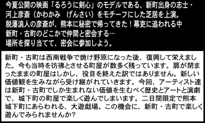 染物と宿の中島屋の入り口に こちらのチラシが貼ってあります! 明日から開催される、 熊本城下町を舞台としてアートと演劇でタイムスリップ! 「KUMAMOTO 城下町大遊戯 2012」 9月29日・30日 10:00~17:00 場所:熊本市新町古町界隈 いろいろと面白そうですよ! この機会に熊本城下町へ☆ 熊本城の見える安いゲストハウス「染物と宿の中島屋」 PR