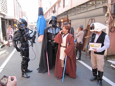 満員御礼でした☆ それもそのはず、 熊本市内を歩けば、色々なイベント会場にぶつかる程の目白押し! 天気も最高でしたので、歩いて、アートの町の河原町へ。 そして、この前のブログでもご紹介してました、 「河原町アワード 2010」開催中の為、 各地より、ジャンル様々なアーティストが集結しています☆ 見物人もたくさん!!! 歩行者天国の河原町には、 巨大な作品も!(驚) ちょっと、疲れたら、お洒落なオープンカフェもいい感じ☆ そして、染物と宿の中島屋にご宿泊されていたお客様も出展! 鉄アートの薪ストーブです☆ 機関車のかまのようにも見え、上には鉄瓶! 面白いですね!色々な個性的デザインの薪ストーブを製作されておられます。 興味のある方は大勝工炉さんまでTEL0996-63-4375 染物と宿の中島屋からと言うと、話が早いと思います☆ そして、最後は、 世界的にも有名な方も河原町を見学にお越しでした! ダースベーダーご一行様(笑) 楽しい一日でした☆ 熊本城の見える安いゲストハウス「染物と宿の中島屋」 PR