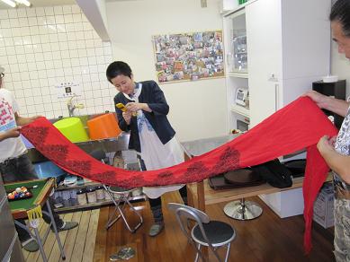 アトリエとなりつつある今日この頃ですが、 先日も新町織りでご紹介いたしました「モヒカンポシェット」さんが、 染物であるものを復活をさせるべく、お越し頂きました☆ 今回は、一番左に写っている新たな作家さんもご一緒に! 今回は、どちらの方も持ち込みの染め直しです! その物とは、蔵から出てきた酒袋と絹の帯☆ 酒袋は画像に残っていなくすみません。 そして、絹の帯は長い歴史で付いてしまった汚れも目立たなくなり、 本来の刺繍とマッチした綺麗な赤に染まり上がりました! モヒカンポシェットさんも満足いく染め上がりで、一安心☆ この帯が、今度はモヒカンポシェットさんのデザインによって、 素敵なポシェットへと生まれ変わります! どんな商品に変身するのか楽しみです☆ 熊本城の見える安いゲストハウス「染物と宿の中島屋」 PR