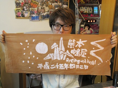 そんな快適な季節に染物体験! と、言うことで、 皆さまの作品をご紹介させて頂きます♪ パーフェクトな純和風ハンカチです! お次は、 絞り染め柄が美しいTシャツのお客様☆ さて! お次は「さいこうだもん」のくまモン手ぬぐい! スマイルも素敵な涼しげな水色ハンカチのお客様♪ 最後のお客様はシンプルながら、 格式高い家紋付きハンカチーフです! 皆さまもオリジナル染物作品を楽しく作ってみませんか!? お待ちいたしております☆ 熊本城の見える安いゲストハウス「染物と宿の中島屋」 |