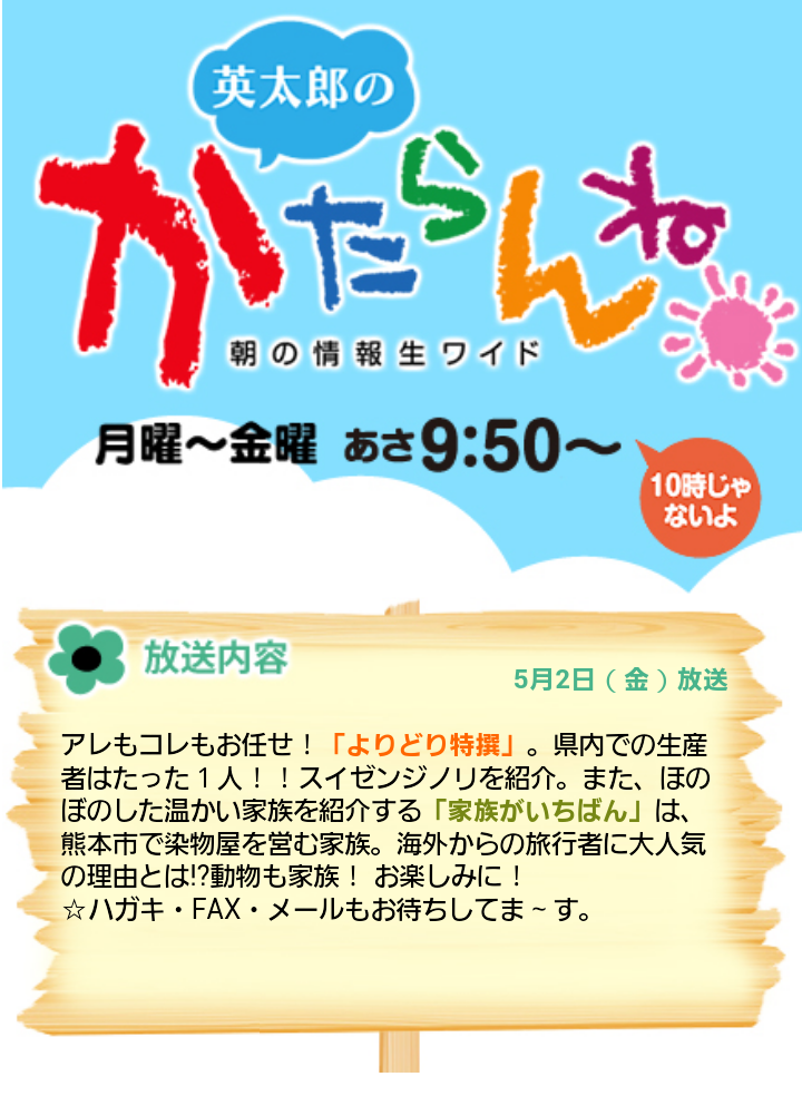 今月、 TKUテレビ熊本さんが 染物と宿の中島屋に突然お越しになられ、 いきなり密着取材が始まるという 驚きの一日が放送されました! 知らない間に、 中島屋の前に撮影隊の皆さんと リポーターさん! 素敵に映していただきました♪ そして、 朝から一緒に掃除をお手伝いいただきました☆ 思いがけないお手伝いさん(笑) チェックインの時間になれば、 海外からのお客さんとも楽しくコミュニケーション(笑) それと、 中島屋と言えば染物体験! 終始冷や汗が止まらないサプライズな一日となりました! ご覧いただきました皆様、 ありがとうございました! まさか、 テレビでドッキリを仕掛けていただけるとは夢にも思っておりませんでしたので、 貴重な経験をさせていただきました テレビ熊本の皆様、 本当にありがとうございました! 熊本城の見える安いゲストハウス「染物と宿の中島屋」 PR