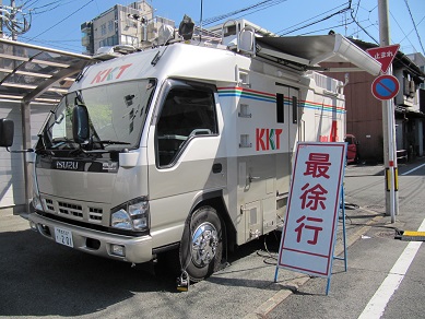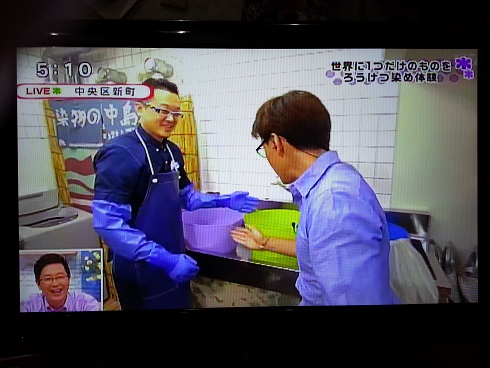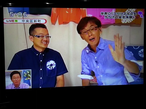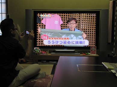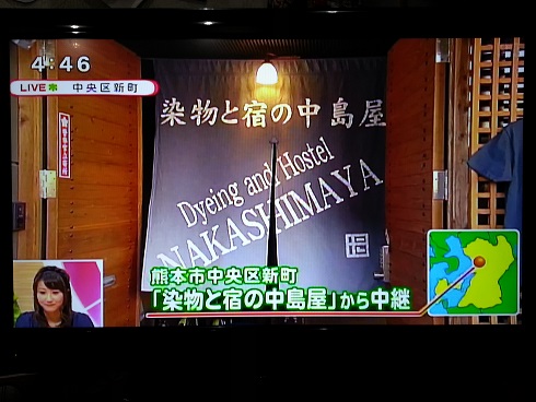 急遽、 染物と宿の中島屋より初のテレビの生中継をおこなっていただきました! 中島屋の前には貫禄のある中継車が到着! その中継車から ケーブルを長ーく、長ーく、伸ばし、 屋上の送信アンテナへ! そして、 このアンテナが狙うのが小さく見える山の上のアンテナ! これでセット完了! 中島屋の前にも中継のスタンバイOK! そして、 とうとう!中継スタート! その頃、私は生中継をテレビで見ながら のんきに写メを写すのでした(笑) そして、 いつまでものんびりしているわけではありません! いよいよ出演となりました! 今回は染物体験のご紹介と言うことで、 生中継で染物体験! 放送ではこんな感じに☆ 皆さまのおかげを持ちまして、 無事に中継終了いたしました☆ ご覧頂きました皆さま、 そして、 KKTくまもと県民テレビの皆さま本当にありがとうございました! 熊本城の見える安いゲストハウス「染物と宿の中島屋」 PR