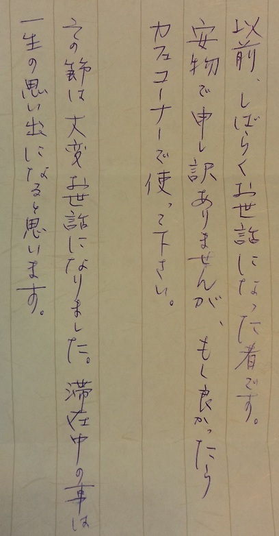 驚くことがありました! 染物と宿の中島屋の玄関に ひとつのペーパーバックが置いてあり、 中には コーヒーとお砂糖、 そして、 匿名のお手紙! お手紙の内容は以下の通りです♪ 一瞬、 傷ついた鶴を助けた「鶴の恩返し」や、 雪の中のお地蔵様に笠をかぶせた「かさこ地蔵」など、 昔話の恩返しが頭を過ぎりましたが、 そんな身に覚えもありませんので、 本当にご宿泊いただいたお客様からのご好意で、 わざわざ、 届けて頂いたに違いありません! 文末には一生の思い出とまで書いていただき、 中島屋冥利に尽きます! ただ、 匿名でしたもので、 お礼の言葉すら言えず申し訳ありませんが、 感謝の気持ちでいっぱいです! ありがたく、 旅人さんにおいしいコーヒーを飲んでいただきたいと思います☆ ありがとうございました!!! 熊本城の見える安いゲストハウス「染物と宿の中島屋」 PR
