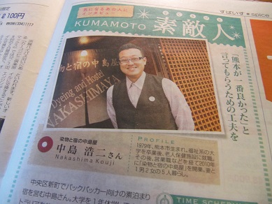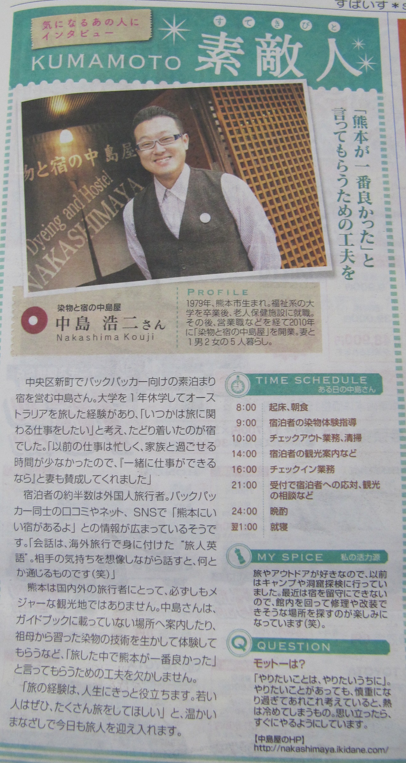 熊本日日新聞社さん発行の 「すぱいす」に掲載いただきました! 恥ずかしながら、 「素敵人」として☆ 熊本限定ではございますが、 ご覧いただけますと幸いです。 熊本ではない皆さまは 下の画像をクリックすると大きくして全部みることが出来る予定です! この度ご掲載いただきました 熊本日日新聞社さん本当にありがとうございました! 熊本城の見える安いゲストハウス「染物と宿の中島屋」 PR