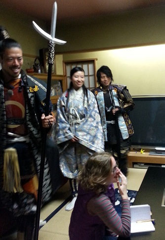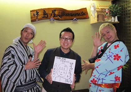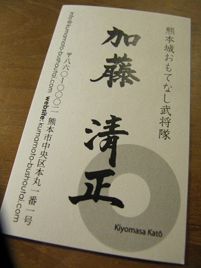 皆さんがお越しになられました! 昨夜は東京のテレビ局の皆さんが 吉本の芸人さん「ガリットチュウ」のお二人と、 熊本城でお馴染みの「熊本城おもてなし武将隊」 そして、「名古屋おもてなし武将隊」の皆さんは、 時間の都合により途中でご帰宅(残念!) 中島屋の中では!!! 突然の武将の登場にフランスからのお客さんもビックリ! ガリットチュウのお二人も サービスいっぱいで笑わせてもらいました(笑) 熊本城おもてなし武将隊の皆さんは、 お忍びにて城下へ参られた際は 染物体験をしに来ていただけるとのうれしいお言葉まで! 最後に加藤清正様の名刺を頂戴いたしました! とっても楽しい時間をありがとうございました! 放送は東京方面なので、 熊本では見ることはできませんが、 TOKYO MX 11月29日 14:30~ 見ることのできる方はよろしくお願いします☆ また、 遠いところテレビ局の皆さまありがとうございました! 熊本城の見える安いゲストハウス「染物と宿の中島屋」 PR