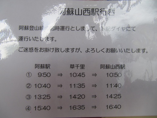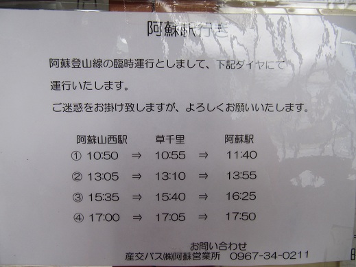 阿蘇の公共交通機関がストップしているので、 中島屋で臨時阿蘇ツアーをしようかとも考えておりましたが、 阿蘇の公共交通機関が応急的ではございますが復活しております! まずはJR☆ 線路が寸断されている所もあるので、 一部の区間はJRが用意している代行バスに乗り換えて阿蘇へ到着! そして、 阿蘇駅から噴火口のある中岳までを結ぶバスが 道路が通行止めの為運休しておりましたが、 迂回路を利用して山上までのバスが復活しました! 今までと時刻表が変わっておりますので、 お気をつけください☆ ※行き(阿蘇駅から阿蘇山西駅) ※帰り(阿蘇山西駅から阿蘇駅) これでやっと、 晴れ間が見えてきました☆ みなさん! 梅雨が明けたら阿蘇へGO! 熊本城の見える安いゲストハウス「染物と宿の中島屋」 PR