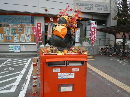 熊本中央郵便局のポストの上ではタヌキが栗拾いをしていました!
