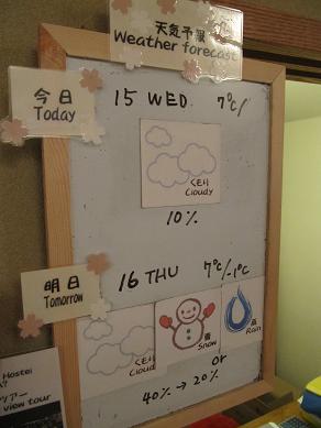 だからか知りませんが、 今日から急激に寒くなりました! 熊本の最高気温が7度で、初の1桁入りです。(あまり嬉しくない) 旅人にとって天気は重要です。 ただ、旅先の天気予報はなかなかわからない事が多いので、 染物と宿の中島屋には簡単な天気予報ボードを受付横に設置しています☆ その、天気予報ボードの明日の予報に、 この冬初の雪マークとマイナスの文字が!!! 特に通勤がない私は、 宿の中から雪が降り始める風景を楽しみにしています☆ 熊本城の見える安いゲストハウス「染物と宿の中島屋」 PR