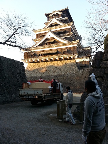 熊本県立劇場にて文楽 人形浄瑠璃が公演されます! 東京・国立劇場公演時も連日盛況だったと言う、 加藤清正をモデルとした文楽 人形浄瑠璃「八陣守護城(はちじんしゅごのほんじょう) 加藤清正生誕450年記念して熊本に参ります! そして、 この公演を前に、 熊本城本丸御殿にて、 有名なシーンの一部を披露する催しがあるとのことで、 既に熊本入りしております舞台装置(船の形をした大型のもの)を 一時保管していただいている城下町のお寺より 熊本城へ運び入れます! どう言うわけか、 お手伝いをさせていただくことになり、 普段は入ることの出来ない 閉城後の観光客が居ない 貸切の熊本城へトラックごと入ります! そして、 こちらも、 普段は入ることの出来ない砂庭に足跡をつけ、 いよいよ、 本丸御殿まで到着! 無事に真っ赤な毛氈の上に設置完了☆ 人形浄瑠璃の舞台装置に直に触れられる貴重な機会となりました! そして、 翌日は撤収で再び夕暮れの熊本城へ行くのでした。 時間が取れたら劇場まで行って文楽を見てみたいと思います☆ 熊本城の見える安いゲストハウス「染物と宿の中島屋」 PR