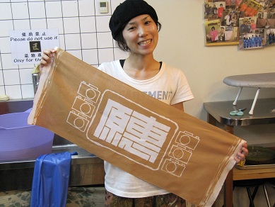 染物体験で皆さんへ選んで頂ける色が増えました! 以前よりリクエストの多かった茶色が仲間入り☆ そして、 まだ私も染めていないにも関わらず、 手ぬぐい染めのお客様が第一号で染色! 少し薄めをご希望でしたので、 カフェオレカラーに染まりイイ感じです!