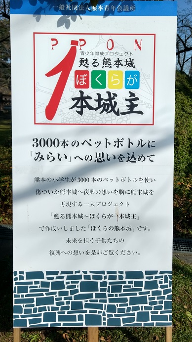 染物と宿の中島屋にお泊りのお客さまへ ささやかなプレゼントがサンタさんよりあったようです (*^-^*) そして、 外は快晴でポカポカ陽気! お散歩かねて熊本城へ すると! 遠くに氷で作られた熊本城らしきものが!? 近づいてみると、 なんと、 材料はペットボトルで作られていました! かなり大きく、 観光でお越しの方々も写真を写しておられました。 そして、そして! これを作ったのは熊本の小学生と書いてあるではありませんか! ダブルの驚きでした! こちらのペットボトル熊本城は 熊本城内にある 「 桜の馬場城彩苑 」正面入り口に展示してあります☆ 熊本城の見える女性専用のゲストハウス「染物と宿の中島屋」ホームページ PR
