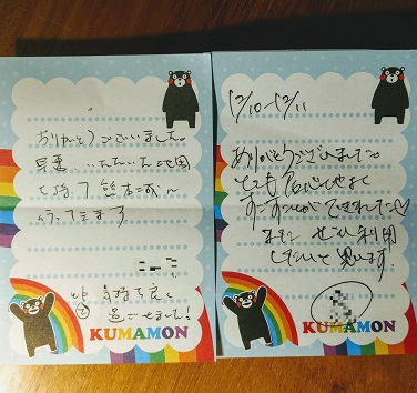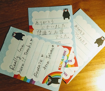 ときどき、 チェックアウトの際に、 受付にメッセージを残していただける お客さまがいらっしゃいます! 本当に朝から嬉しくなります ♪ これからも、 皆さまに喜んでいただける宿屋になれるよう 頑張ってまいります☆ 朝の貴重なお時間に メッセージを書いていただきました皆さま ありがとうございました! またのお越しを心よりお待ちいたしております。 熊本城の見える女性専用のゲストハウス「染物と宿の中島屋」ホームページ |